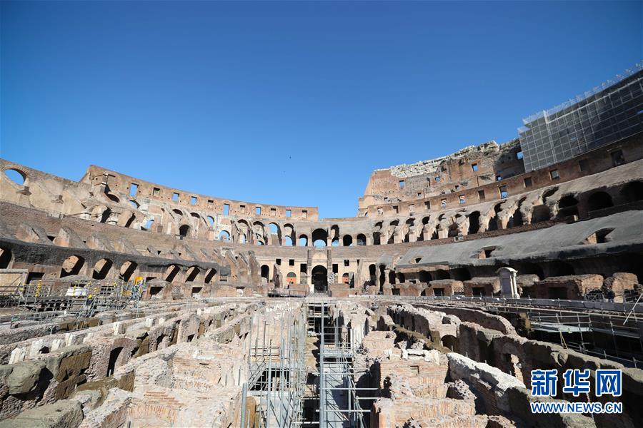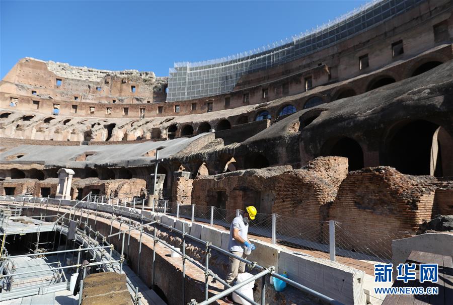 6月1日,在意大利首都罗马,一名工人在斗兽场内进行修复工作。 当日,罗马斗兽场重新开放。出于防疫原因,参观者在入场时被要求戴上口罩、测量体温并进行手部消毒。 新华社记者 程婷婷 摄