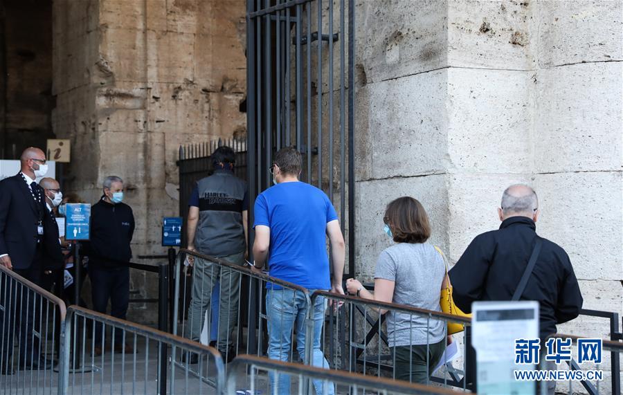 6月1日,在意大利首都罗马,人们在重新开放的斗兽场入口处排队测量体温。 当日,罗马斗兽场重新开放。出于防疫原因,参观者在入场时被要求戴上口罩、测量体温并进行手部消毒。 新华社记者 程婷婷 摄