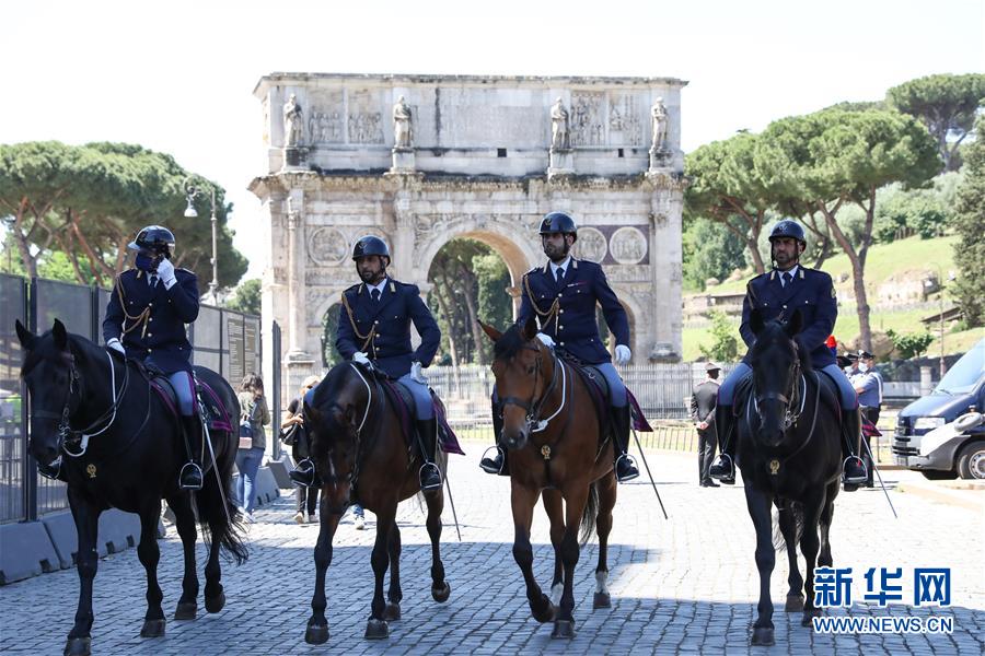 6月1日,在意大利首都罗马,骑警在重新开放的斗兽场外巡逻。 当日,罗马斗兽场重新开放。出于防疫原因,参观者在入场时被要求戴上口罩、测量体温并进行手部消毒。 新华社记者 程婷婷 摄