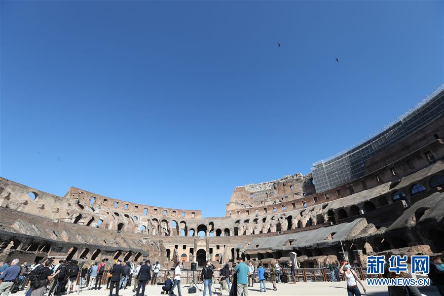 这是6月1日在意大利罗马拍摄的斗兽场内部景观。 当日,罗马斗兽场重新开放。出于防疫原因,参观者在入场时被要求戴上口罩、测量体温并进行手部消毒。 新华社记者 程婷婷 摄