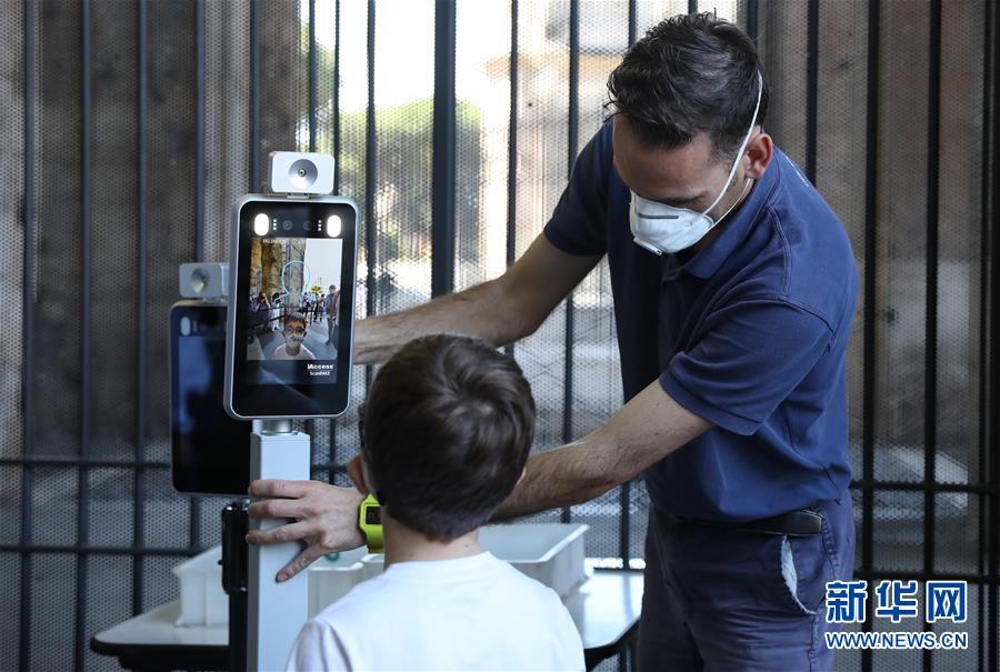 6月1日,在意大利首都罗马,一名男孩在重新开放的斗兽场入口处测量体温。 当日,罗马斗兽场重新开放。出于防疫原因,参观者在入场时被要求戴上口罩、测量体温并进行手部消毒。 新华社记者 程婷婷 摄