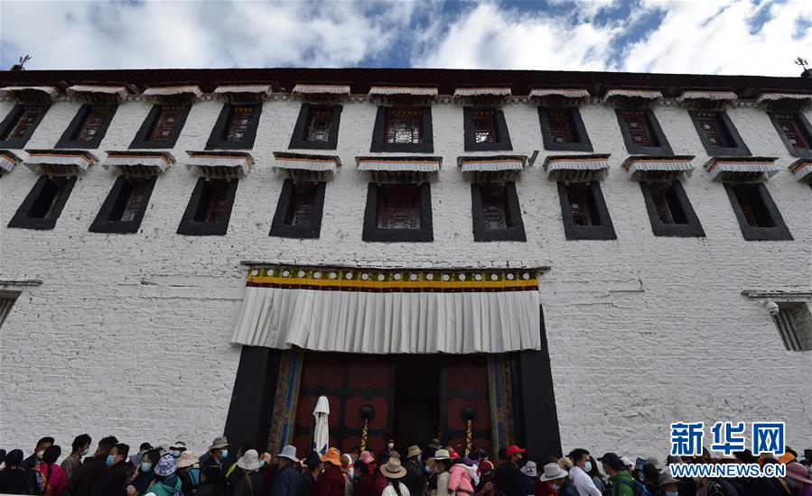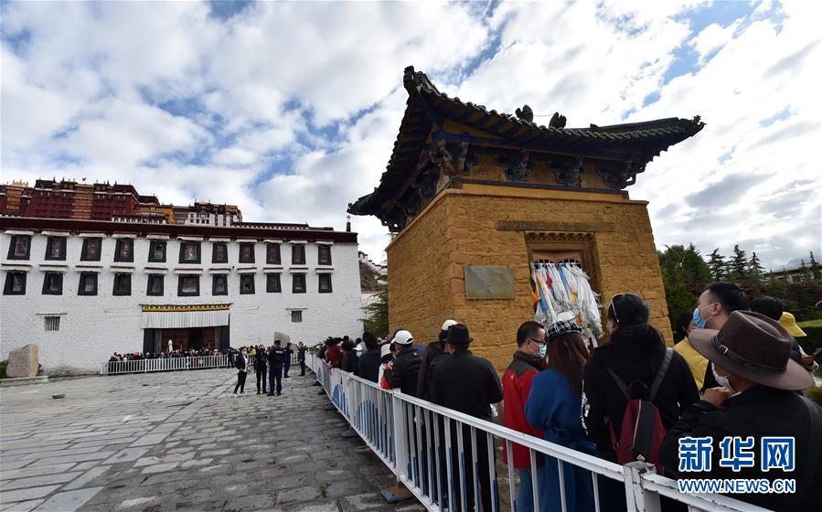 6月3日,游客等待进入布达拉宫参观。 当日,西藏布达拉宫有序恢复对外开放。开放期间实行预约、分时、限流参观。 新华社记者 觉果 摄
