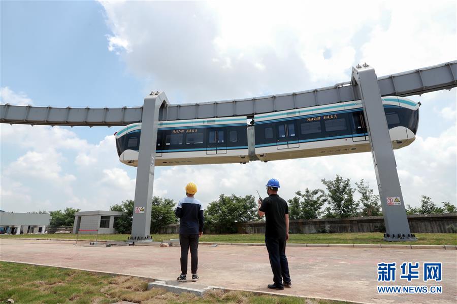 6月4日,科研人员启动空中轨道列车进行高温天气下的试跑。 当日,由武汉中铁科工集团承接的“空中轨道列车”在位于武汉的江夏制造基地完成高温下的试跑。据了解,“空轨”是悬挂式单轨列车,由钢铁或水泥立柱支撑在空中,列车最高时速80公里。目前,中铁科工集团已承接全国第一条“空轨”商业线——恩施青云崖旅游观光线项目。 新华社发(赵军 摄)
