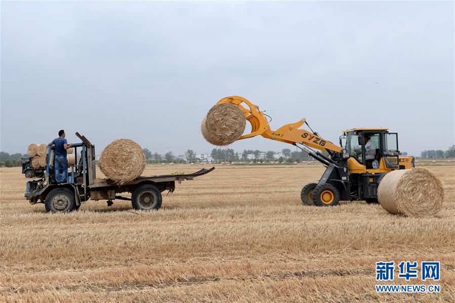 6月9日,在安徽省五河县新集镇姚管村,农民将打包成捆的小麦秸秆装车。