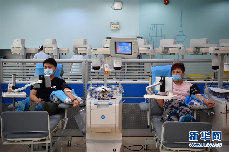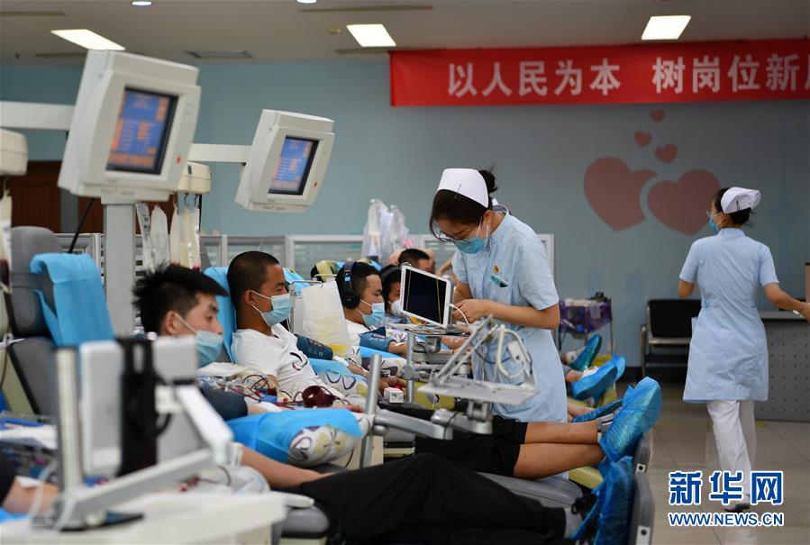 6月14日,献血者在天津市血液中心献血。 当日是世界献血者日,天津市血液中心迎来不少献血者参加无偿献血。 新华社记者 李然 摄