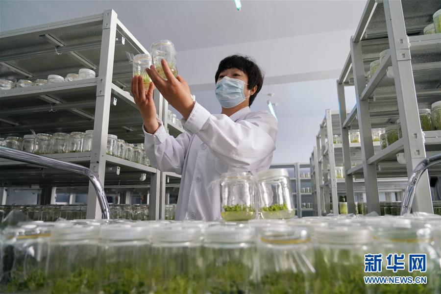 在德胜村大农种业公司无菌育种室,技术人员检查马铃薯瓶苗的长势(5月7日摄)。新华社记者 牟宇 摄