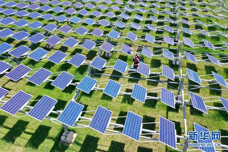 6月23日,德胜村村民在村里的光伏电站清理发电板(无人机照片)。 新华社记者 牟宇 摄