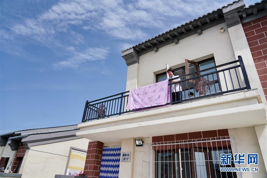 6月23日,德胜村村民孙桂英在自家开办的民宿晾晒床单。 新华社记者 牟宇 摄