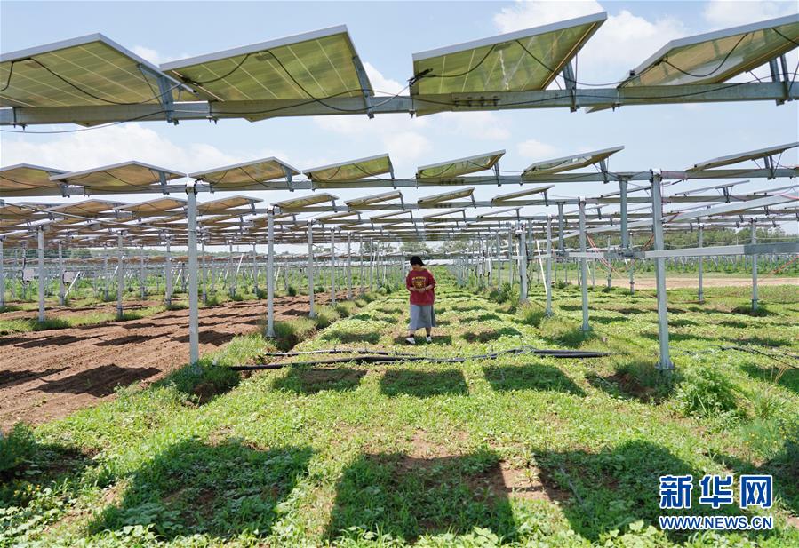 6月23日,德胜村村民徐亚茹在村里“农光互补”项目区光伏发电板下查看种植的药材长势。 新华社记者 牟宇 摄