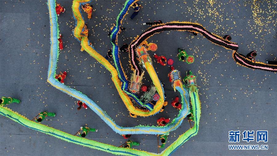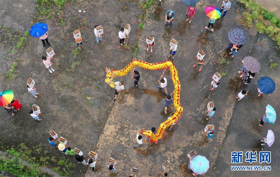 6月25日,在湖南省衡阳市常宁市罗桥镇下冲村,村民在进行舞龙和字灯展演(无人机拍摄)。 当日是端午佳节,各地群众通过丰富多彩的民俗活动共庆这一传统节日。 新华社发(曹正平 摄)