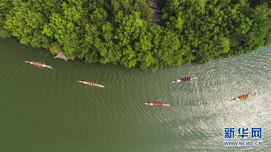 6月25日,龙舟队在京杭大运河山东台儿庄古运河中竞渡(无人机拍摄)。 当日是端午佳节,各地群众通过丰富多彩的民俗活动共庆这一传统节日。 新华社发(高启民 摄)