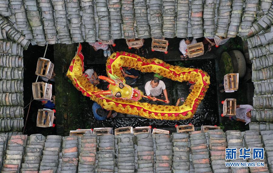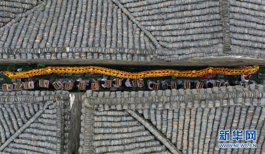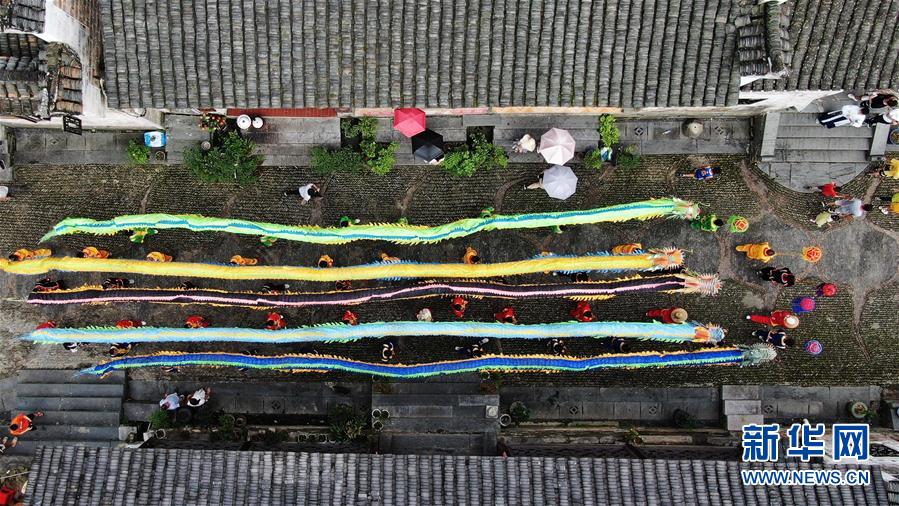 6月25日,舞龙队在贵州省黔东南苗族侗族自治州锦屏县隆里古城进行“花脸龙”巡演(无人机照片)。 当日是端午佳节,各地群众通过丰富多彩的民俗活动共庆这一传统节日。 新华社发(杨晓海 摄)