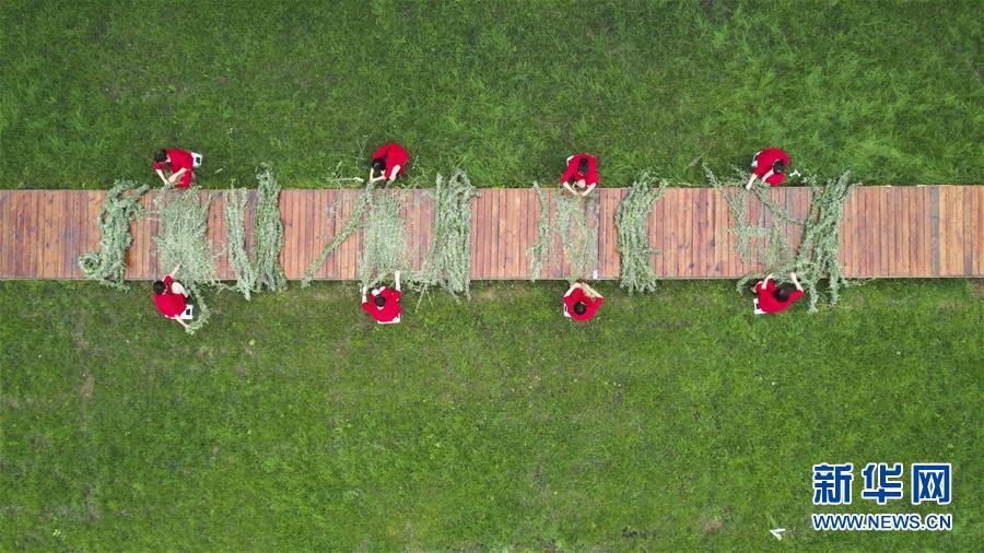 6月25日,河北唐山遵化市兴旺寨乡花椒园村的村民在进行艾草编织火绳比赛(无人机照片)。 当日是端午佳节,各地群众通过丰富多彩的民俗活动共庆这一传统节日。 新华社发(刘满仓 摄)