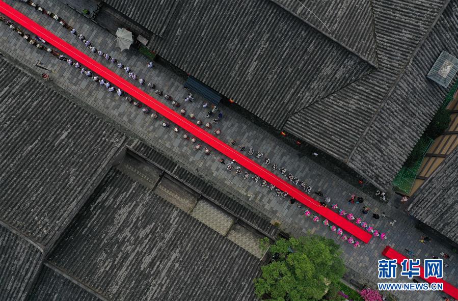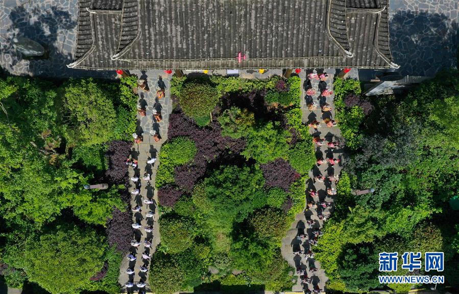 6月25日,苗族盛装表演巡游队伍穿行在贵州省黔东南苗族侗族自治州丹寨县万达小镇景区(无人机照片)。 当日是端午佳节,各地群众通过丰富多彩的民俗活动共庆这一传统节日。 新华社发(黄晓海 摄)