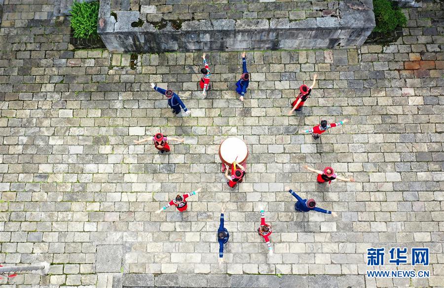 6月25日,民间艺人在重庆市酉阳土家族苗族自治县龚滩古镇西秦会馆展演国家级非遗项目“酉阳土家摆手舞”。 当日是端午佳节,各地群众通过丰富多彩的民俗活动共庆这一传统节日。 新华社发(邱洪斌 摄)