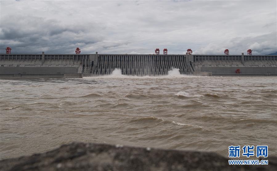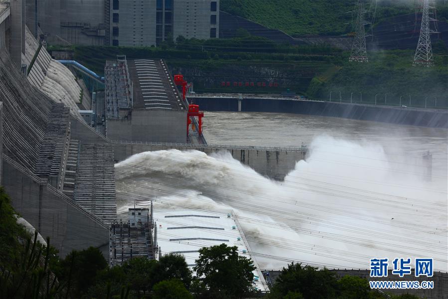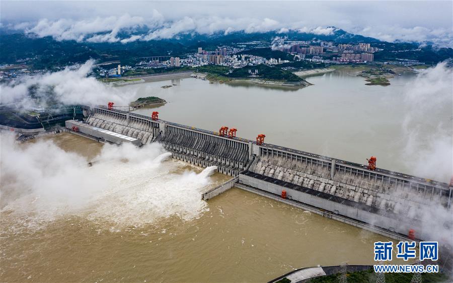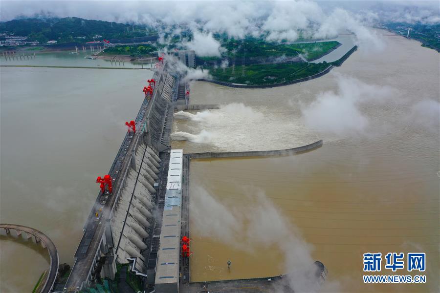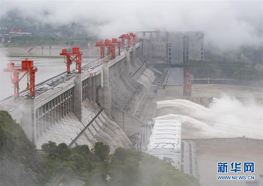 6月29日,三峡枢纽开启泄洪孔泄洪。 受长江中上游强降雨影响,进入三峡水库的水量持续增多。为腾出一定库容迎接近期可能到来的洪水,三峡枢纽于6月29日上午开启两个泄洪孔,加大下泄流量。这是三峡枢纽今年首次泄洪。 28日14时,三峡水库入库流量达4万立方米/秒,是27日14时的两倍。为应对此轮来水,长江防总要求将三峡水库下泄流量上调至日均3.5万立方米/秒。 新华社发(黄善军 摄)