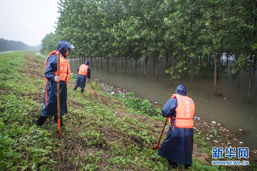7月7日,武汉市洪山区防汛人员在武汉天兴洲江堤观察水情。