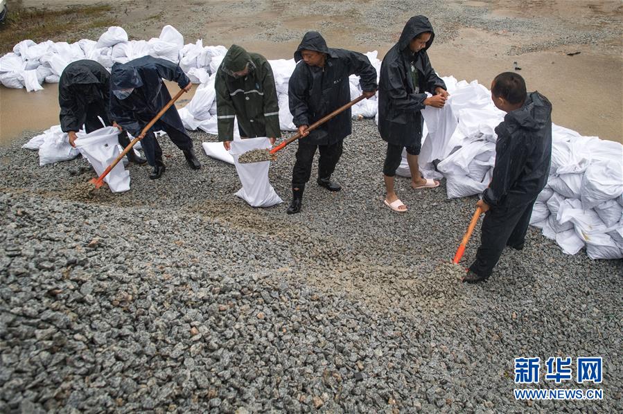 7月7日,武汉市洪山区天兴乡工作人员在装填防洪石料。新华社记者肖艺九摄