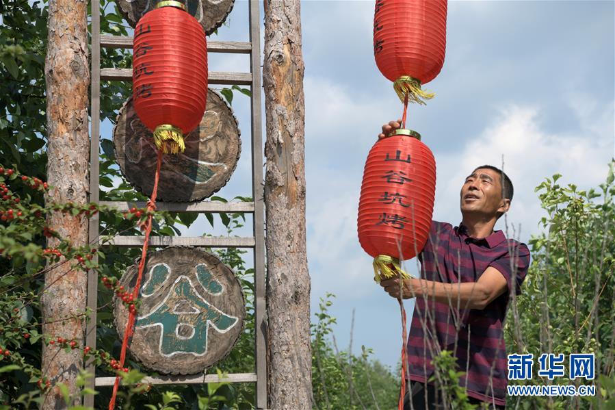 林盛村脱贫户王海峰是“老王农庄”的经营者,这是他在查看农庄灯饰(7月7日摄)。
