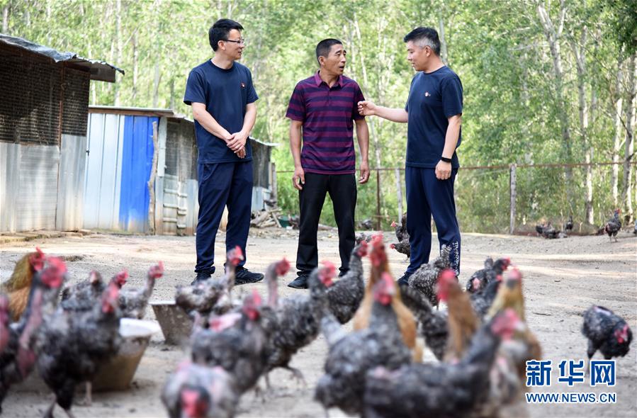 林盛村驻村工作队队长、第一书记那文国(右)向林盛村脱贫户王海峰(中)了解森林鸡养殖情况(7月7日摄)。新华社记者 程子龙 摄