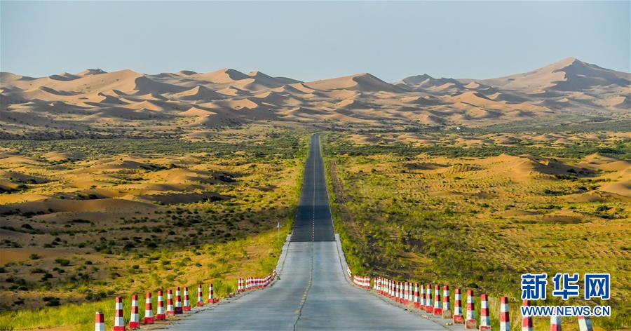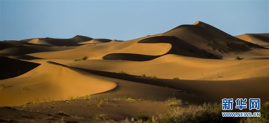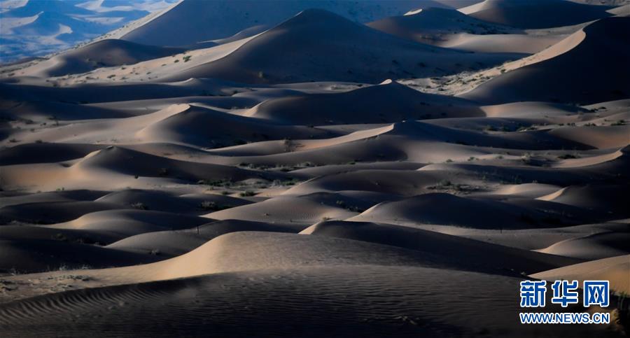 这是7月8日拍摄的腾格里沙漠风光。 位于内蒙古自治区阿拉善左旗西南部和甘肃省中部边境的腾格里沙漠是我国第四大沙漠,总面积约为4.3万平方公里。夏日傍晚,腾格里沙漠连绵的沙丘被日光勾勒出美丽的线条,美不胜收。 新华社记者 连振 摄
