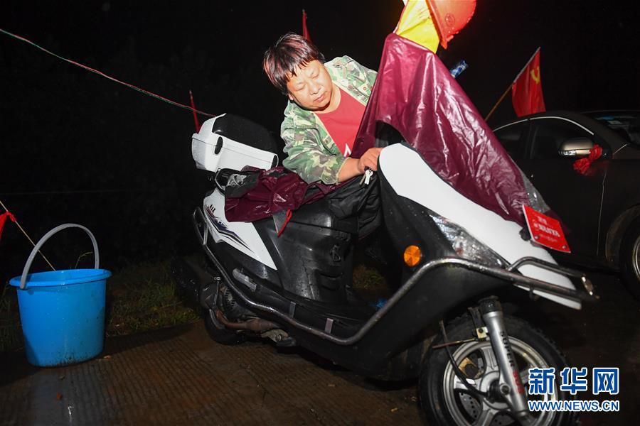 7月7日深夜,在沅江市南嘴镇目平湖大堤参加防汛值守的村民交接班后准备骑车回家。 新华社记者 陈泽国 摄