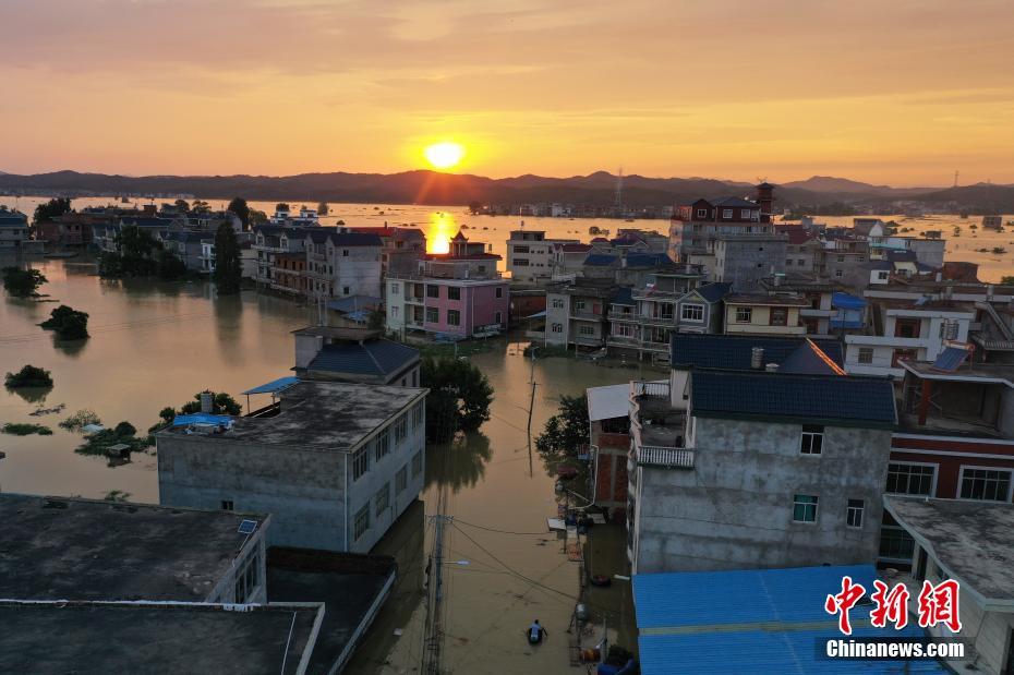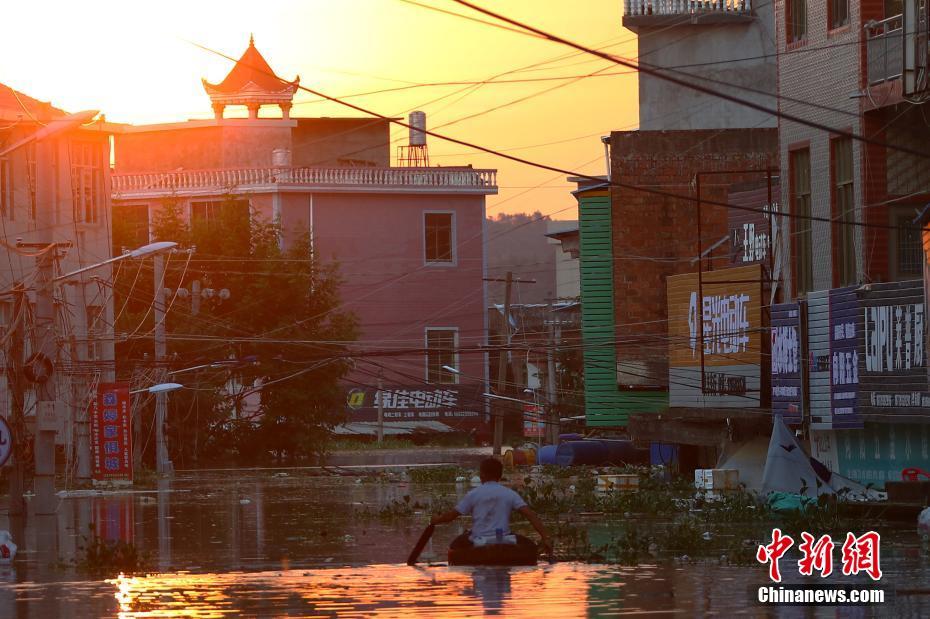 7月13日,江西鄱阳县油墩街镇荻溪村,村民划着小船前行。受持续强降雨影响,鄱阳湖水位持续上涨,地处鄱阳湖水系西河之畔的鄱阳县油墩街镇,因洪水漫顶侵入,周边数个村庄受淹。中新社记者 刘占昆 摄