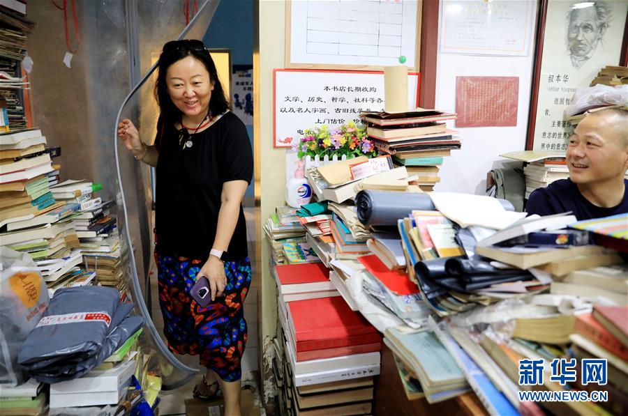 7月13日,一名读者(左)走进复旦旧书店。 在上海杨浦区政肃路一家菜市场的楼上,有一家专门经营旧书的书店,67平方米的空间外加半环绕的阁楼上,近五万本各类书籍将必要通道以外的所有空间占满,空气中弥漫着旧书特有的气息。 书店的主人是来自江苏盐城的张强夫妇。从2002年开店至今,这家只出售旧书的书店靠着爱书人的口耳相传,渐渐有了点名气。张强介绍说,曾经也想给书店起一个有点内涵的名字,但因为开在复旦大学生活区内,又是经营旧书的,大家口中的“复旦旧书店”这个名字就被沿用了下来。 复旦旧书店里的书籍,从漫画书到工具书,品类繁杂应有尽有。这里的书籍没有分类,是因为张强想让读者在有限空间里看到更多不同种类的书籍,既为来到这里的读者找书,也为这里的书找读者。 新华社记者 方喆 摄