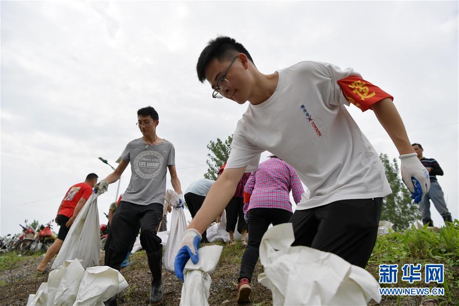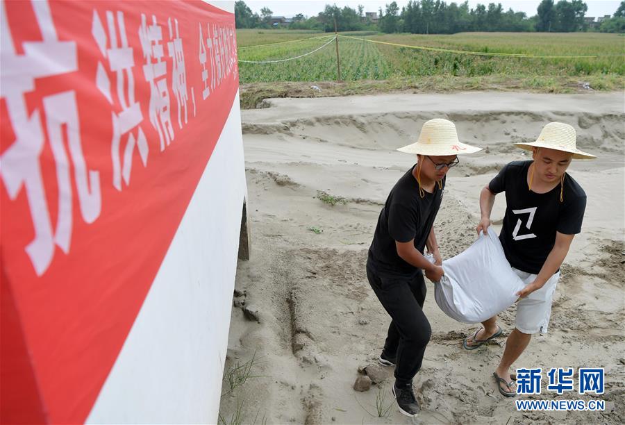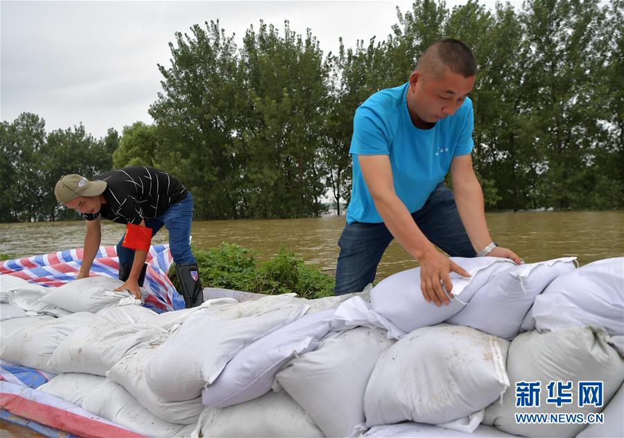 7月13日,在江西省九江市柴桑区江新洲的防洪大堤上,22岁的熊朝剑(左)和28岁的徐冬冬在装沙袋。 他们目前都在九江市区工作生活,看到了《致江洲在外乡亲的一封信》后立即返乡参与防汛工作。新华社记者 彭昭之 摄