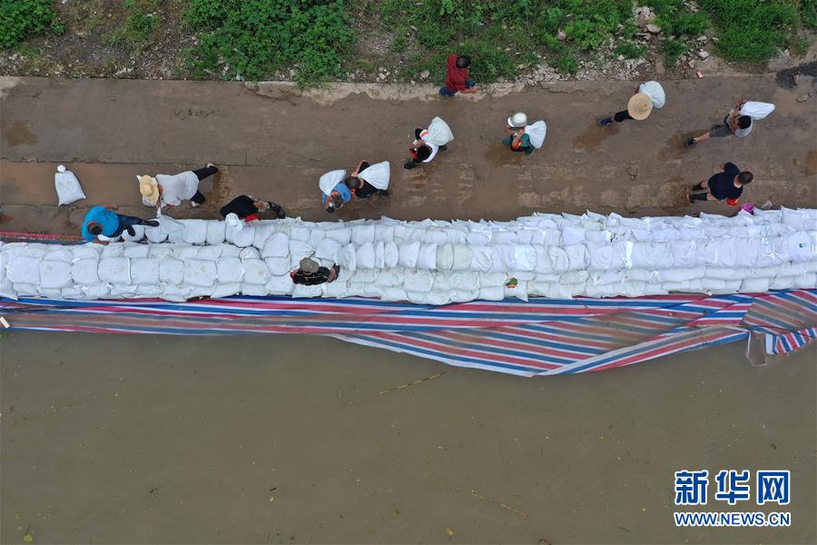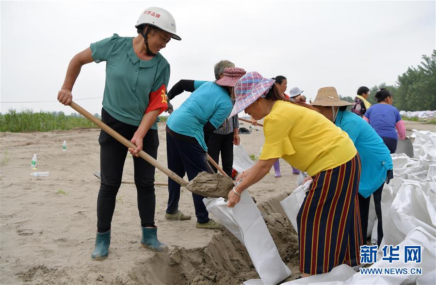 7月13日,在江西省九江市柴桑区江新洲的防洪大堤上,55岁的周香枝(左一)和村民们一起装填沙袋。 她是江新洲上蔡洲村人,在外务工多年,在九江市区安了家,此次是专门返乡参与防汛工作。新华社记者 彭昭之 摄