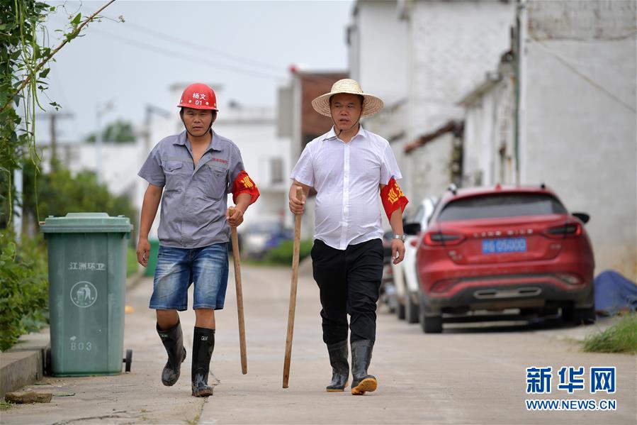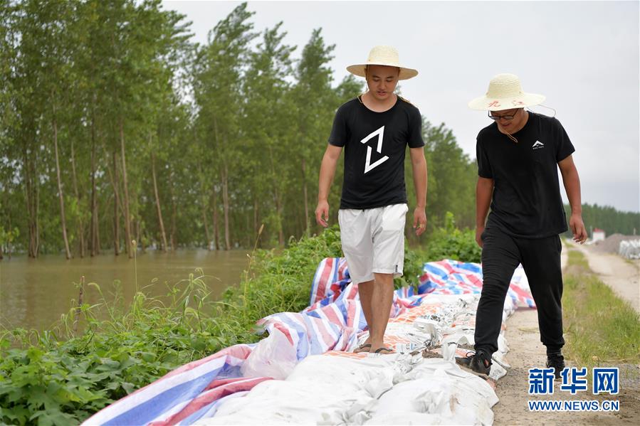 7月13日,杨世文(左)、杨世友兄弟俩在他们负责的坝段巡查。 兄弟俩目前在福建泉州工作,他们自驾回家,并带来了价值一万多元的防汛物资,“我们俩在这里长大,一草一木都有感情,必须回来。”杨世文说。 新华社记者 彭昭之 摄