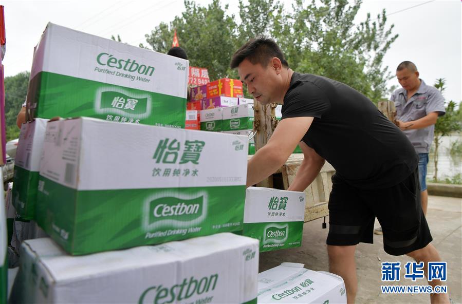7月13日,在江西省九江市柴桑区江新洲江洲镇前埂村,36岁的张选多在搬运清点当日运到的防汛物资。张选多从小在江新洲长大,目前在九江市做生意,返乡参与防汛工作后,村里让他负责搬运清点防汛物资。 新华社记者 彭昭之 摄