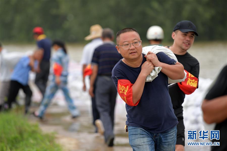 7月13日,在江西省九江市柴桑区江新洲的防洪大堤上,42岁的蔡锦祥在搬运沙袋加固大堤。 蔡锦祥是江新洲上蔡洲村人,家安在了九江市区,此次看到了《致江洲在外乡亲的一封信》后立即返乡参与防汛工作。 新华社记者 彭昭之 摄