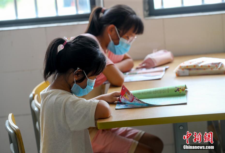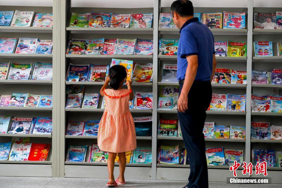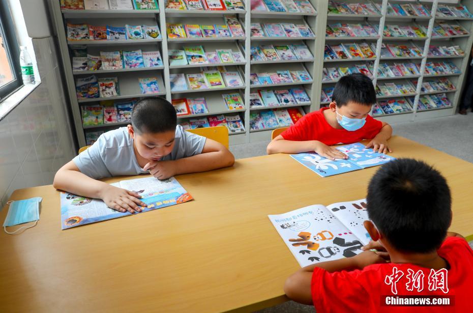 7月14日,湖北省黄冈市黄梅县新开镇第二小学安置点内,孩子们在阅览室里阅读课外读物。中新社记者 张畅 摄