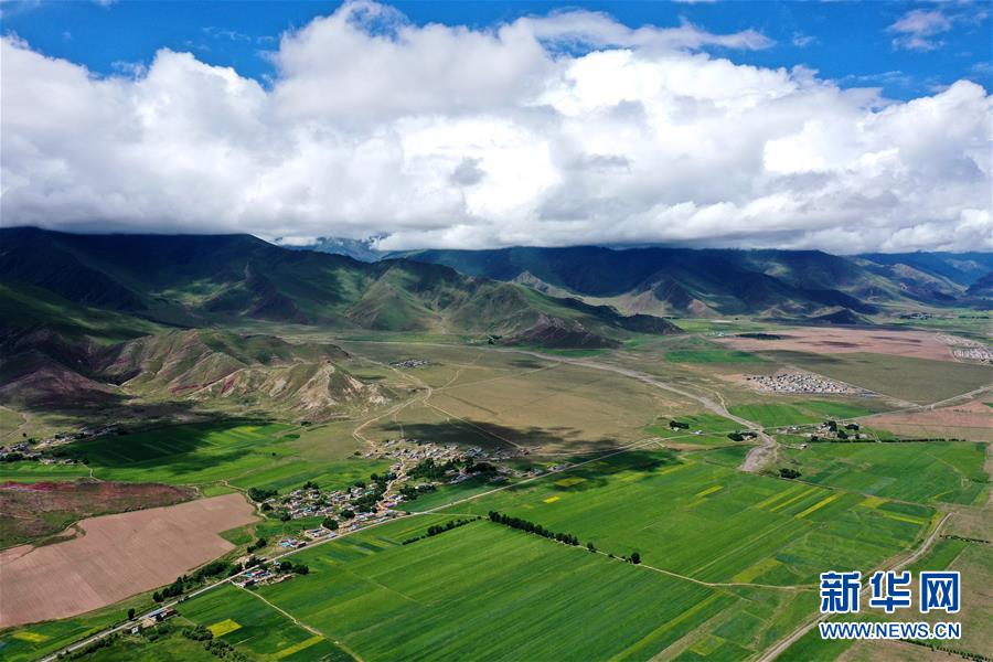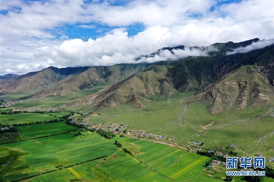 拉萨市林周县边交林乡田园景色(7月14日摄,无人机照片)。 林周县地处西藏中部,拉萨河上游。夏日时节,这里水草丰茂,绿意盎然,河流、村落、农田组成一幅美丽的田园画卷。 新华社记者 詹彦 摄