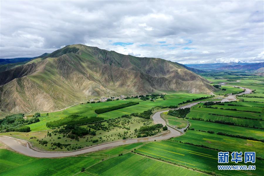 拉萨市林周县卡孜乡田园景色(7月14日摄,无人机照片)。 林周县地处西藏中部,拉萨河上游。夏日时节,这里水草丰茂,绿意盎然,河流、村落、农田组成一幅美丽的田园画卷。 新华社记者 詹彦 摄