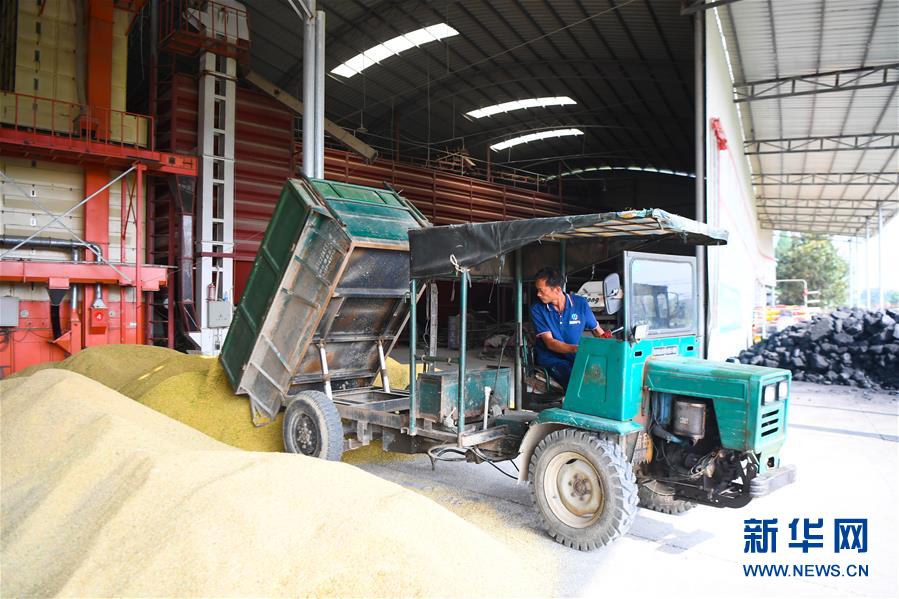 7月14日,益阳市赫山区兰溪镇的农户将湿稻谷运到上渡水稻种植农民专业合作社烘干。 当日,湖南省益阳市赫山区的农民趁着难得的晴天,抓紧抢收、烘晒稻谷。 新华社记者 薛宇舸 摄