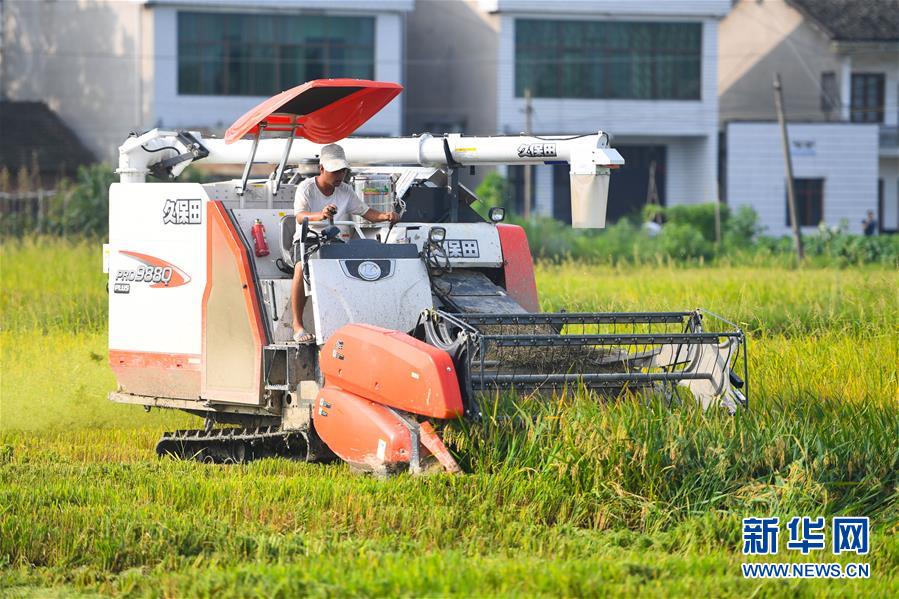 7月14日,益阳市赫山区兰溪镇的农户在田间收割水稻。 当日,湖南省益阳市赫山区的农民趁着难得的晴天,抓紧抢收、烘晒稻谷。 新华社记者 薛宇舸 摄