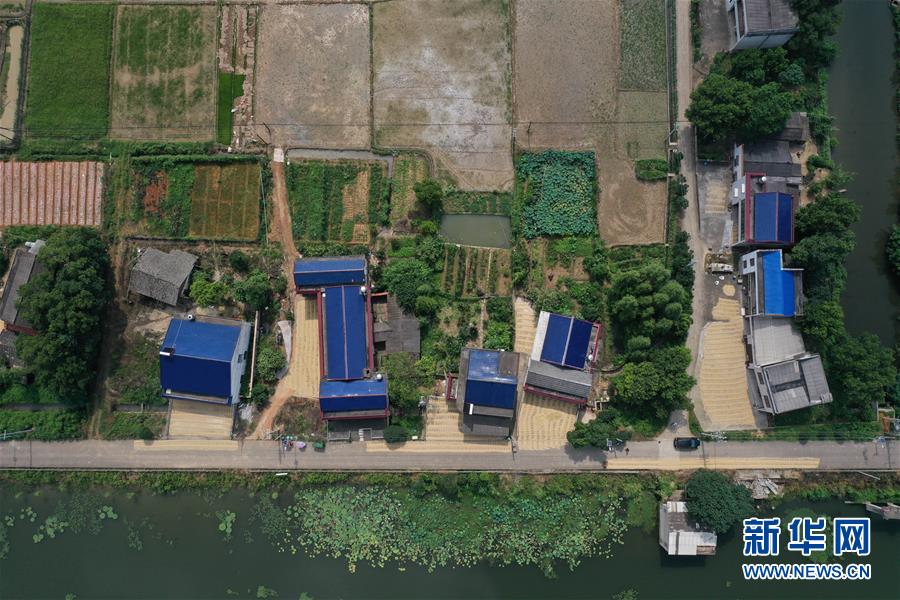 7月14日,益阳市赫山区泉交河镇的农户趁着天晴在家门口晾晒稻谷(无人机照片)。 当日,湖南省益阳市赫山区的农民趁着难得的晴天,抓紧抢收、烘晒稻谷。 新华社记者 周勉 摄
