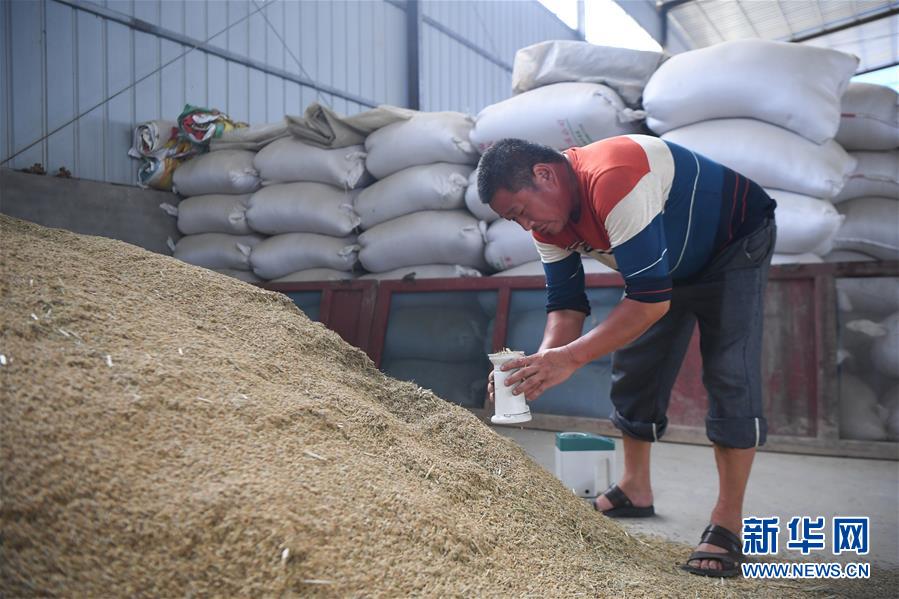 7月14日,益阳市赫山区欧江岔镇红胜水稻种植专业合作社工作人员在测量烘干后稻谷的含水量。 当日,湖南省益阳市赫山区的农民趁着难得的晴天,抓紧抢收、烘晒稻谷。 新华社记者 薛宇舸 摄