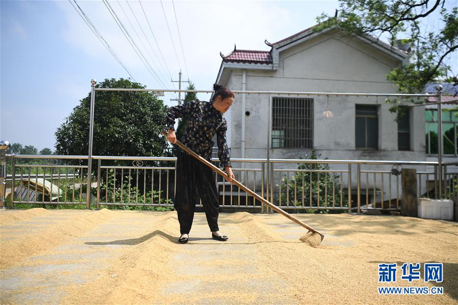 7月14日,益阳市赫山区泉交河镇的农民在家门口晾晒稻谷。 当日,湖南省益阳市赫山区的农民趁着难得的晴天,抓紧抢收、烘晒稻谷。 新华社记者 薛宇舸 摄