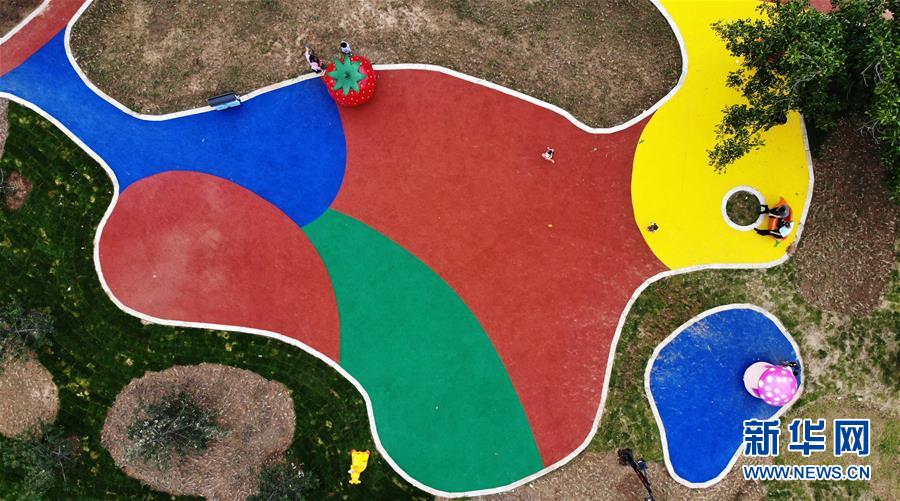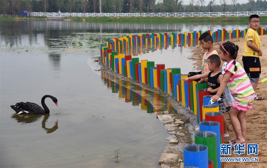 7月14日,小朋友在汶上县白石镇北泉村民俗旅游区玩耍。 近年来,山东省汶上县在乡村振兴过程中整治乡村环境、发展生态产业,建设美丽宜居的绿色乡村。 新华社记者 王凯 摄