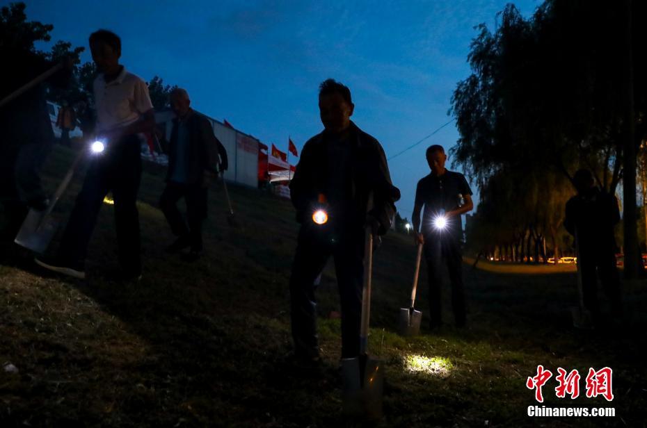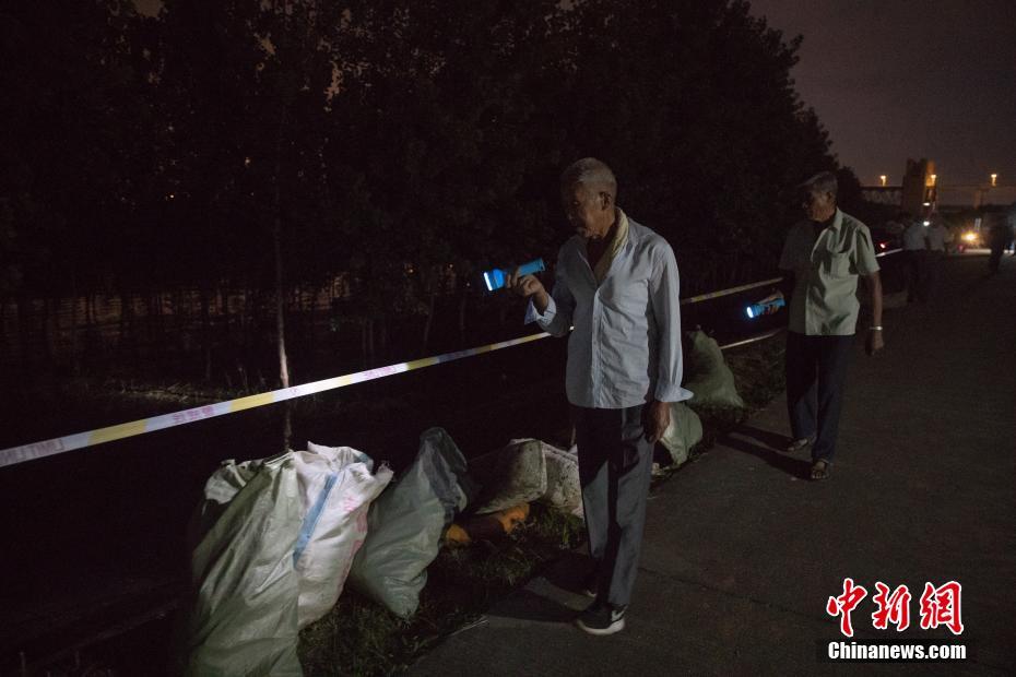 7月15日晚,“银发护堤队”的老人们夜巡大堤。在湖北省黄梅县小池镇桥头堡社区有一支四十余人的“银发护堤队”,他们平均年龄75岁,自知道汛情起,这群老人就自发上堤,装运沙袋,巡查险情。中新社记者 张畅 摄