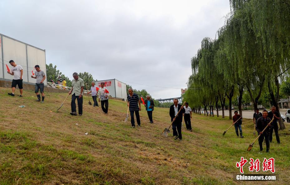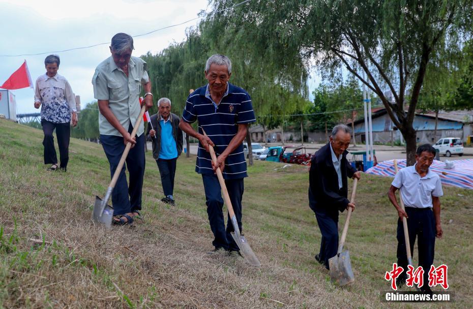 7月15日,“银发护堤队”老人们在大堤巡查。在湖北省黄梅县小池镇桥头堡社区,有一支四十余人的“银发护堤队”,他们平均年龄75岁,自知道汛情起,这群老人就自发上堤,装运沙袋,巡查险情。中新社记者 张畅 摄