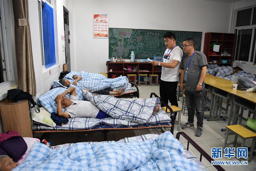 7月20日夜,在团结街小学临时安置点,江心卫生院医生在询问高龄老人身体情况。新华社记者 刘军喜 摄