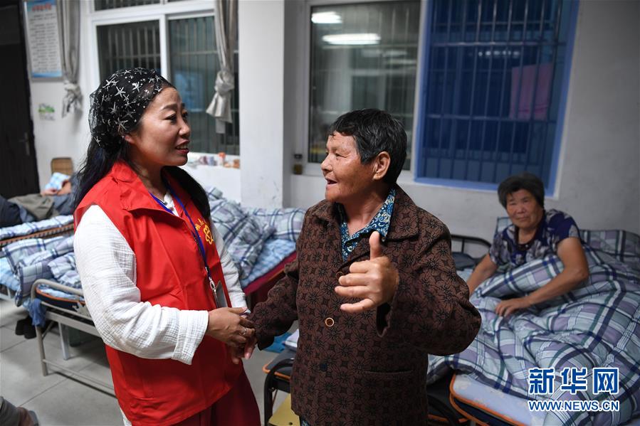 7月20日夜,在团结街小学临时安置点,当涂志愿者张华在陪老人聊天。 新华社记者 刘军喜 摄