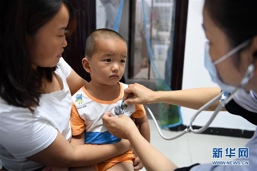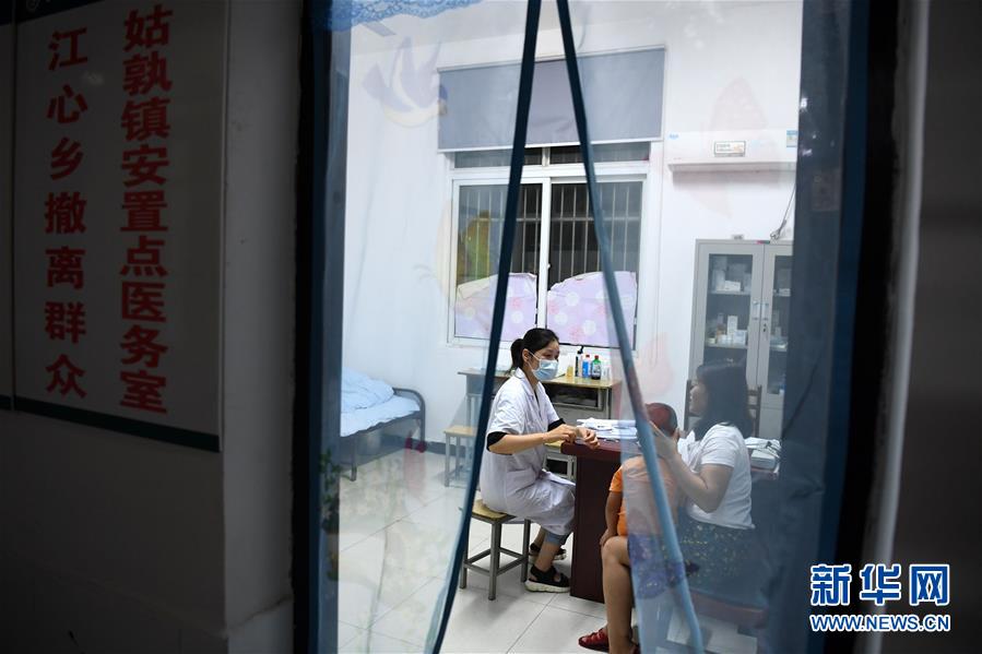 7月20日夜,在团结街小学临时安置点,江心卫生院医生在给儿童检查身体。 新华社记者 刘军喜 摄
