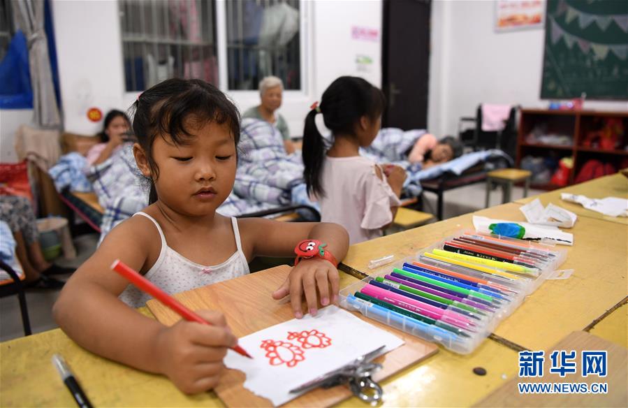 7月20日夜,在团结街小学临时安置点,一名小朋友在画画。 新华社记者 刘军喜 摄