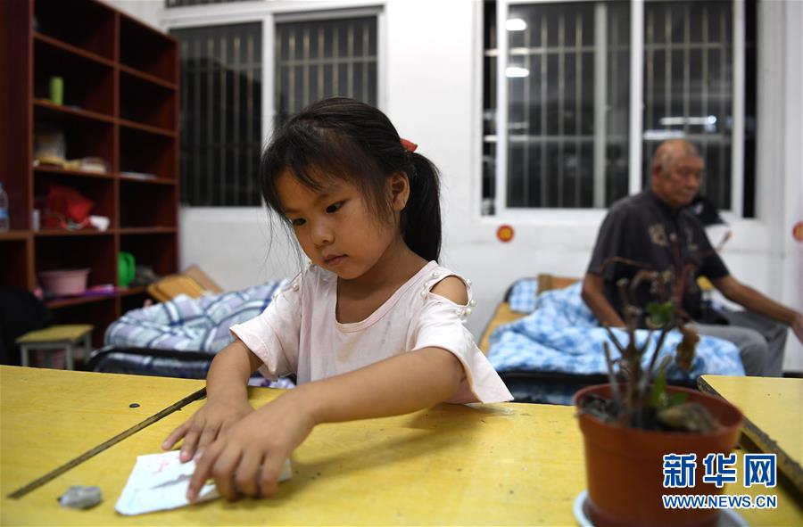 7月20日夜,在团结街小学临时安置点,一名小朋友在玩折纸。新华社记者 刘军喜 摄