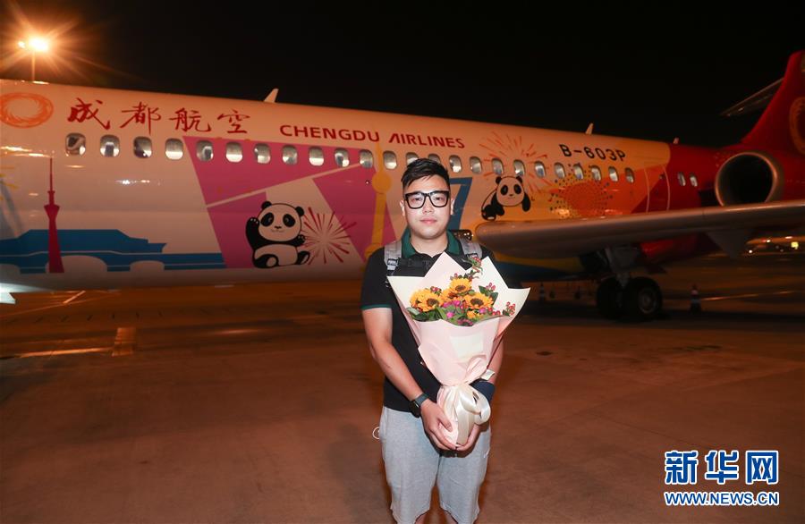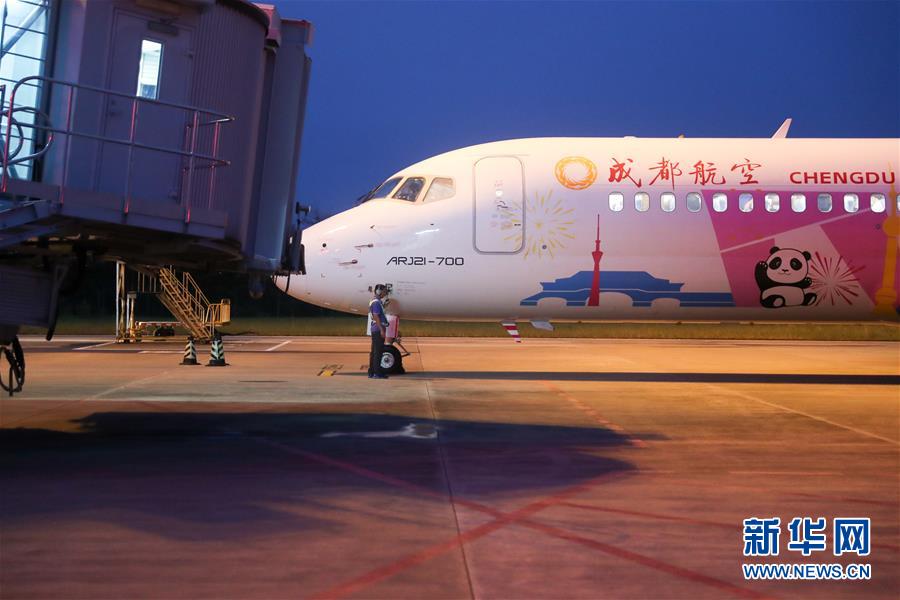 7月20日晚,在成都双流机场,ARJ21飞机的第100万名乘客余浩旻在飞机前合影。 新华社记者 丁汀 摄